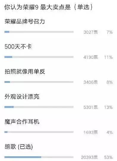 這就是胡歌的魅力所在吧,從下面某平臺(tái)發(fā)出的投票截圖中也可以看出來。最后胡歌將會(huì)對(duì)榮耀9的銷量是否起到很大的作用,還需要數(shù)據(jù)來證明。