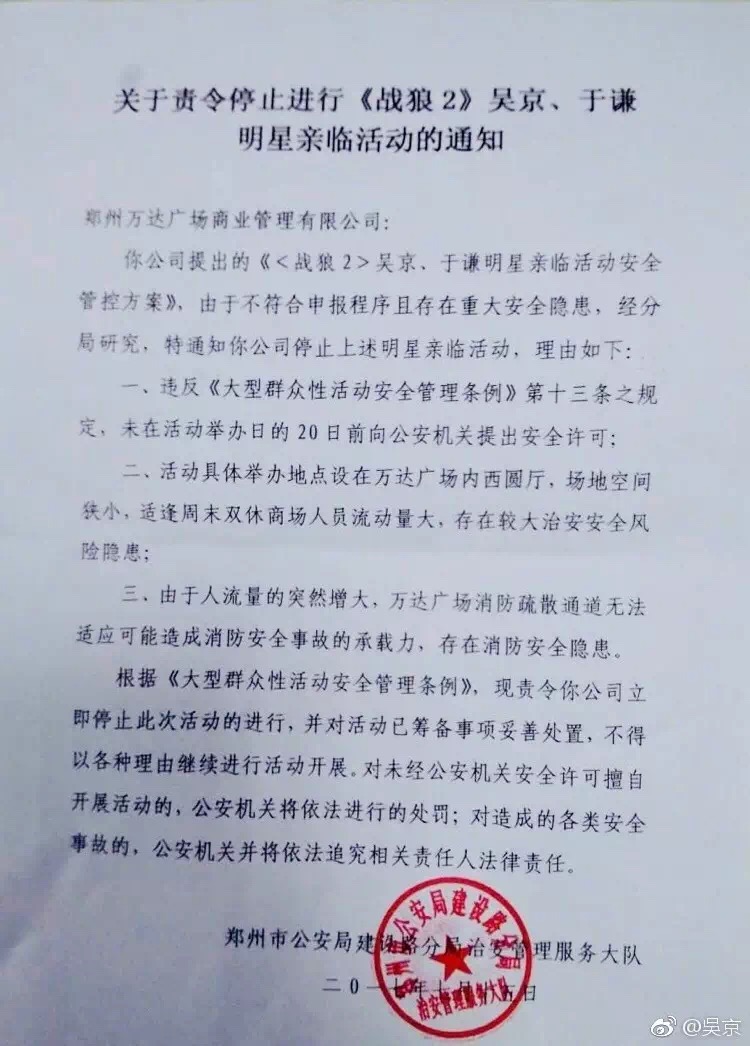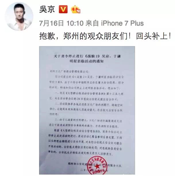 沒想到路演活動才進行了三天,就遇到了“突發(fā)事件”。7月16日上午10點,吳京在自己微博貼出了一張來自鄭州市公安部的責(zé)令停止活動的通知,鄭州路演被臨時叫停,緊接著又發(fā)布了一條道歉視頻。